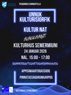 Unnuk Kulturisiorfik 24.01.26 Sermermiut Kulturhus Alakkaagit. Siunnersuuteqartoqarsinnaavoq. Appisimaartoqassooq. Sermermiut Kulturhus 15:00 - 17:00 Akeqanngilaq Akeqanngilaq