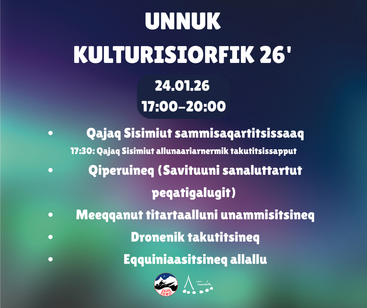 Unnuk Kulturisiorfik 24.01.26 Majoriaq Ilulissat Suliffissarsiuussisarfimmiit: Majoriaq Ilulissat 18:00 - 21:00 Akeqanngilaq Akeqanngilaq